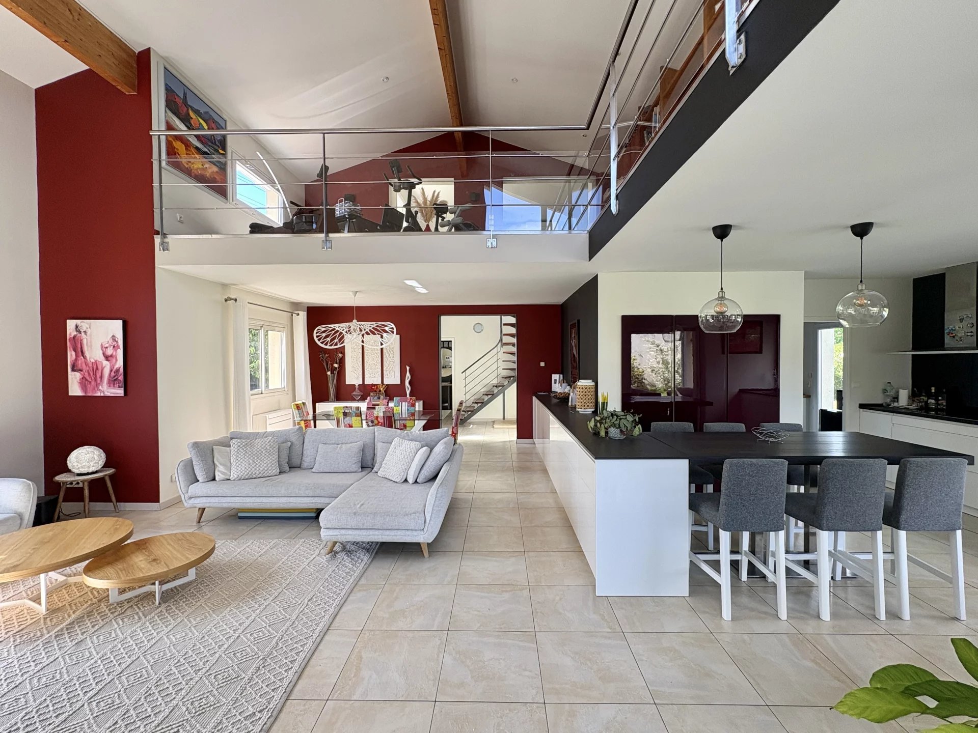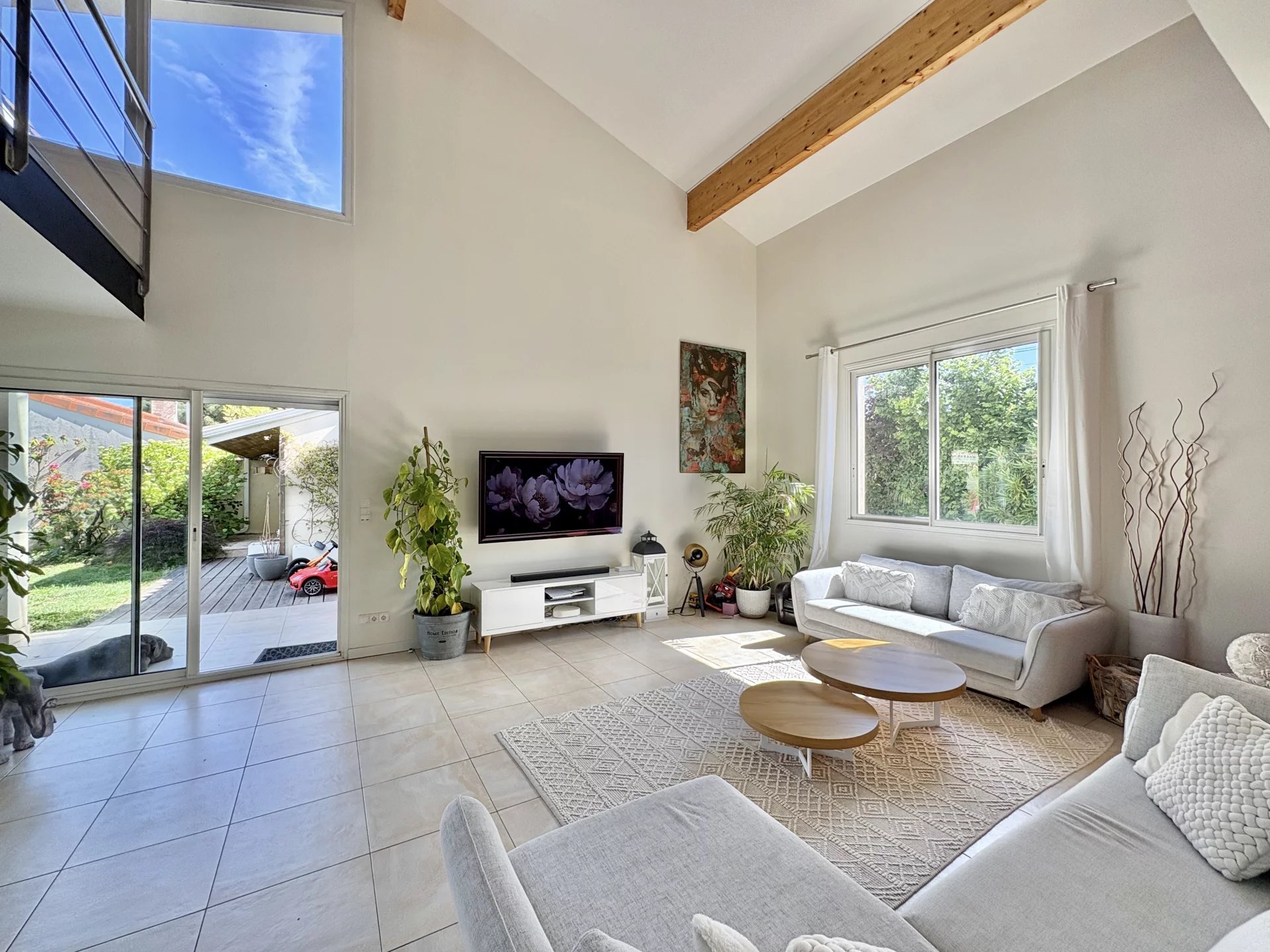Très belle maison contemporaine de 170 m², avec de beaux volumes, comprenant un vaste espace de vie lumineux avec cuisine ouverte entièrement équipée et arrière-cuisine, un WC indépendant ainsi qu’une grande suite parentale en rez-de-chaussée.