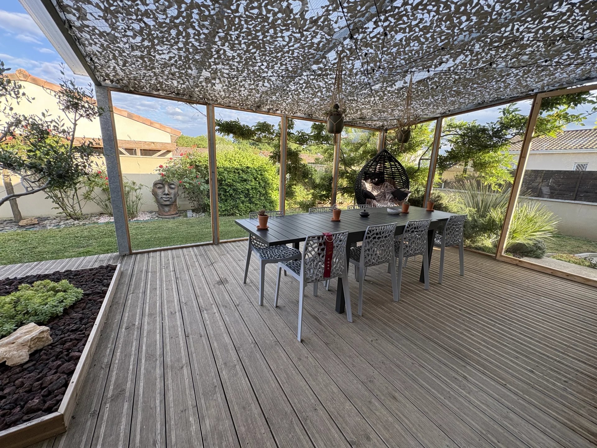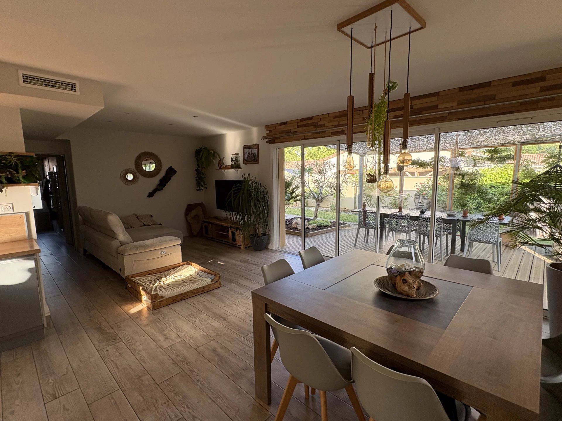 La pièce de vie lumineuse de 47 m², ouverte sur la cuisine, donne sur une grande terrasse, idéale pour profiter du jardin. Trois chambres, une salle d’eau avec douche à l’italienne et des WC séparés. Le tout sur une parcelle de 416 m².